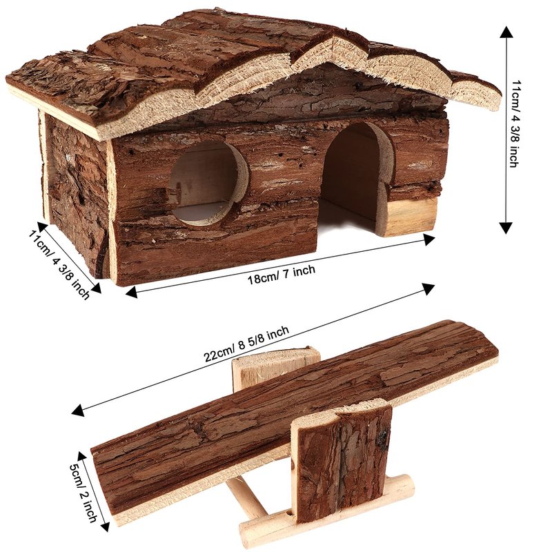 - 🐹FUN WOODEN HIDEOUT: The wooden house is about 8.3 x 4.3 x 5.1 inches. Fun nesting and resting hideout, perfect size for hamsters, rats and other small animals. Satisfy the pets needs to hide, climb and play.