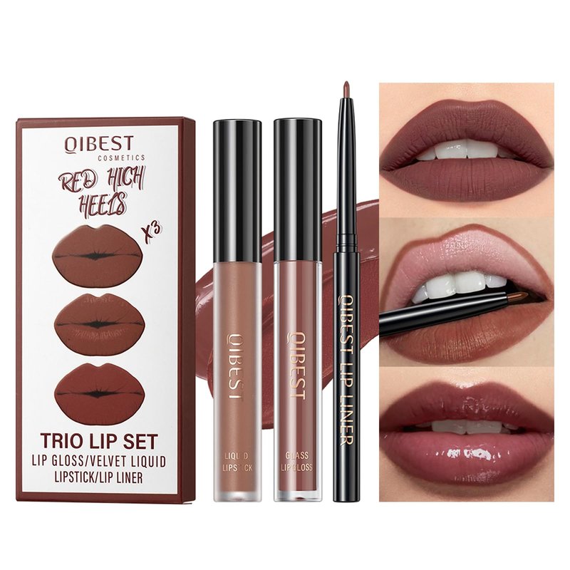 - This is a matte lip glaze / plump lip gloss / lip liner 3 in 1 lip gloss set, can meet the needs of different makeup, the packaging is generous and beautiful, easy to carry around, so you can always keep the perfect lip makeup.