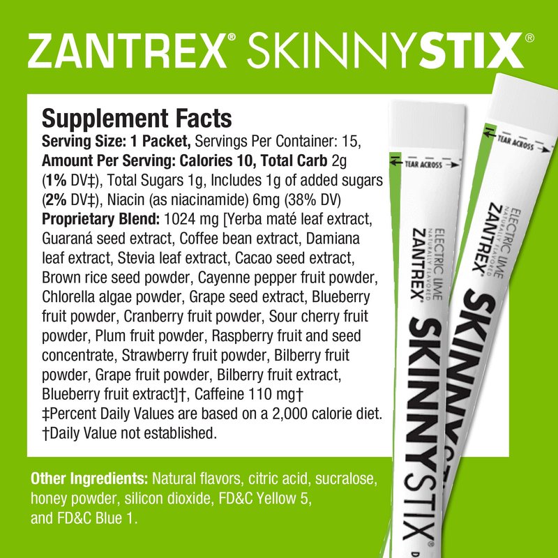 Your Energy Drink Powder, Plus More Zantrex Lime SkinnyStix heighten focus, boost mood, and help curb cravings, all while giving you a blast of energy from natural caffeine sources. SkinnyStix feature a blend of scientifically formulated ingredients, including capsaicin from cayenne pepper, natural sources of phenylethylamines, cocoa extract, and healthy antioxidants from 19 different sources that make it easier for you to hit your goals and stay focused during the day. Plus, the incredible taste will have you coming back again and again.* Science-Backed Results SkinnyStix contain plant-based stimulants from yerba maté, guarana, and damiana. This blend has been shown to curb cravings. SkinnyStix also contain methylxanthines, which have been shown in clinical studies to boost energy, alertness, focus, and mood.* Why Choose SkinnyStix? These stick packs are so easy to use. Just mix in 16 ounces of water at home or take 1 with you when you’re on the go. With only 10 calories, they can help you increase your water intake to boost your hydration as you increase energy and enjoy sipping the delicious flavor. Whether you need help waking up in the morning, want a boost during the post-lunch slump at work, or are out and about and don’t want to slow down, SkinnyStix are the answer.* About Zantrex For over two decades, the Zantrex brand has been a trusted source for body-transforming, explosive high-energy products. Our formulas are backed by science and built on research. We use clinically validated ingredients because we know you want results.