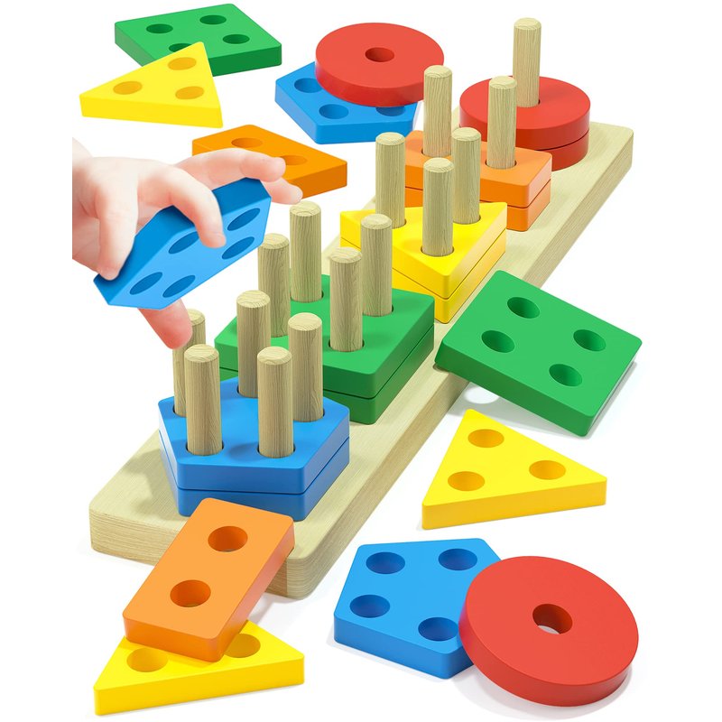 this toddler learning toy is designed to help children develop their fine motor skills, count and sort and better recognize patterns. This wooden stacking puzzle, toddler toys contains 20 pieces including blocks of 5 different colors and 5 geometric shapes.