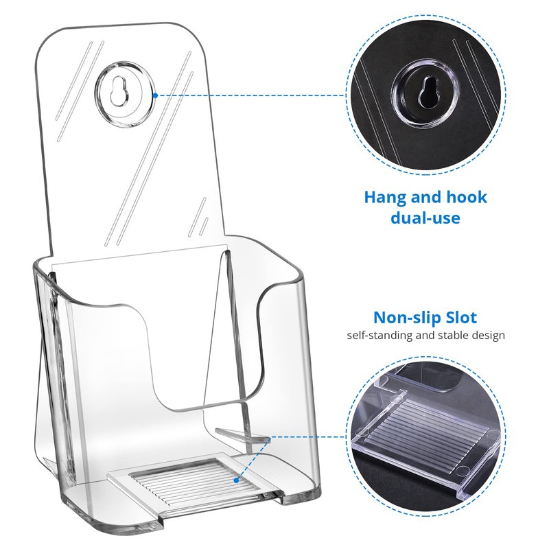 - Perfect Design:This acrylic brochure holder is self-standing, Slanted Back Support on the back of brochure holder allows a smooth movement and more secure standing,you can use as a wall mount brochure holder