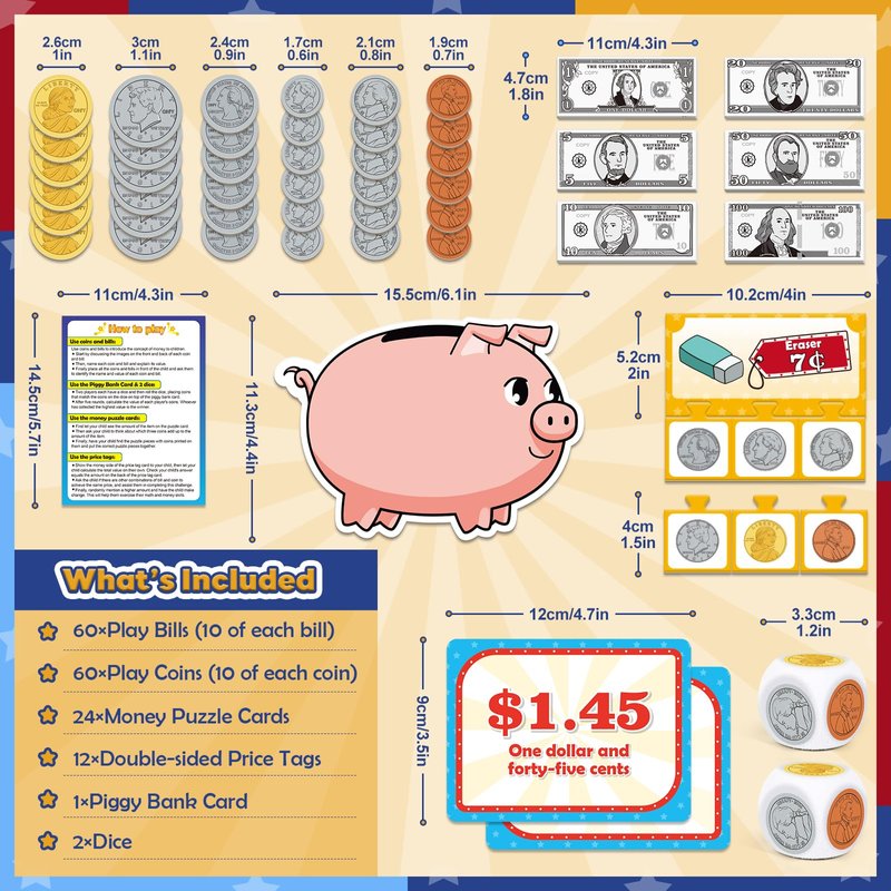 - Complete Money Activity Set: Our money learning set includes 60 play bills, 60 play coins, 24 puzzle cards, 12 double-sided price tags, a piggy bank card, 2 dice, and a guide