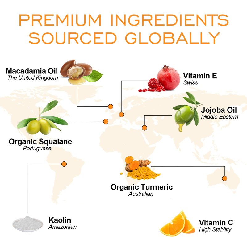 • Global Premium Ingredients for a Natural and Safe Formula - To let our customers get the best clay mask, we select Australian organic turmeric, highly absorbable and stable vitamin C easter, Amazonian kaolin clay, Portugal organic squalane, Israel jojoba oil, natural Australian macadamia seed oil, Switzerland vitamin E, and cold-pressed aloe vera.