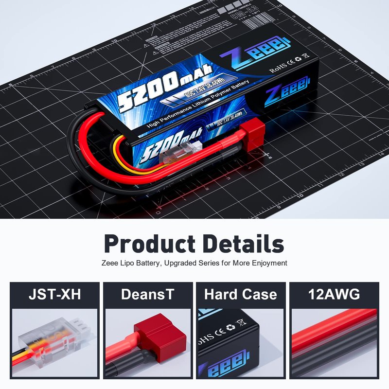 - Zeee 7.4v lipo battery 5200mah with 80C discharge rate hardcase offers you very high power and very long run time for your RC cars.