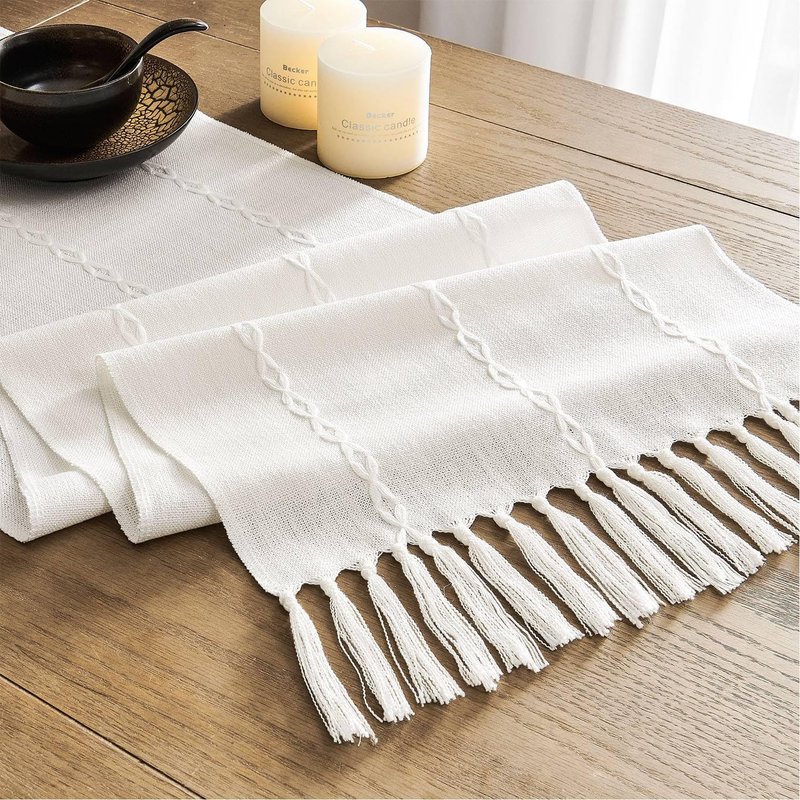 - DETAILED MATERIALS & WORKMANSHIP - Made of premium linen polyester, make it chic feeling, also comfortable to touch, sturdy and anti-wrinkle, good for everyday use. These beautiful table runners are decorated with braided stripes, handmade tassels at each end, adds lots of elegance and charm to your home.