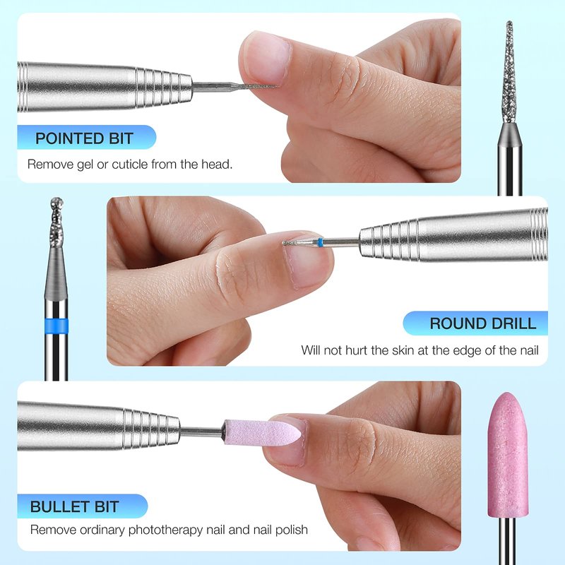 Intersectant stripes of the drill head can help you polish and reshape your nails.