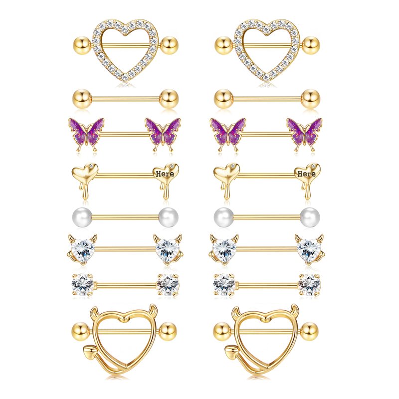 - 【Stylish Nipple Rings Set】Come With 8 Pairs Nipple Rings. Rich in Different Styles and Colors(Silver & Gold & Rose Gold to Choose), Include Ball Nipple Ring, CZ Nipple Ring, Butterfly Nipple Ring, Devil & Heart Nipple Ring. Beautiful and Exquisite, More Choices for Daily Wearing.