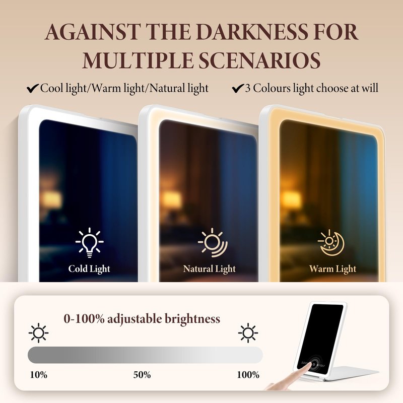 - Multi-function touch screen: This lighted mirror is designed with high-sensitivity touch buttons. Short press to turn on the light, long press to adjust the brightness. Closing the lid will automatically turn off the light, with color temperature memory light function. You can also keep track of the current time and temperature conditions at any time, so you won't miss any party.