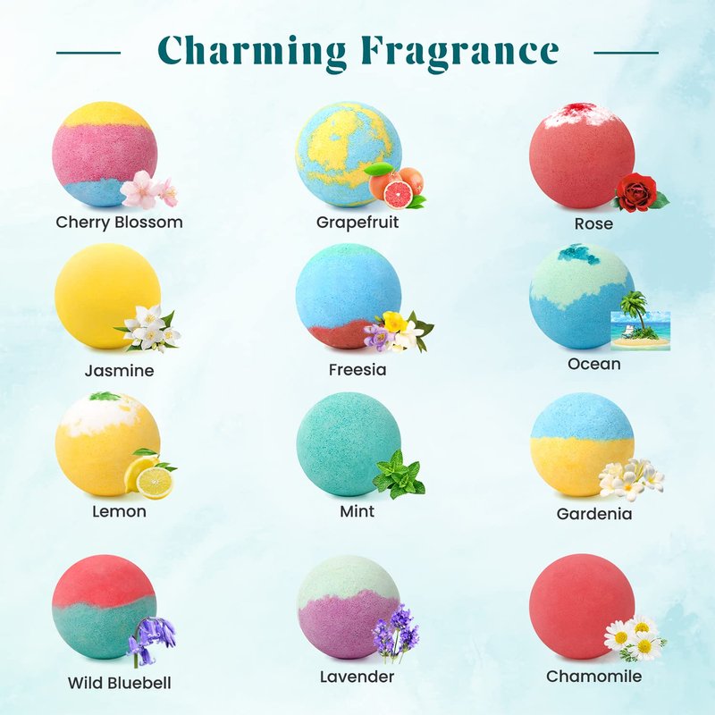 - ★[12 Fragrances] 12 bath bombs, each with a unique fragrance. Rose, jasmine, cherry blossom, lavender, mint, chamomile, etc. We have selected the most popular 12 fragrances to provide a varied and luxurious experience. Tired out after a long business trip? Use Zenbombs!