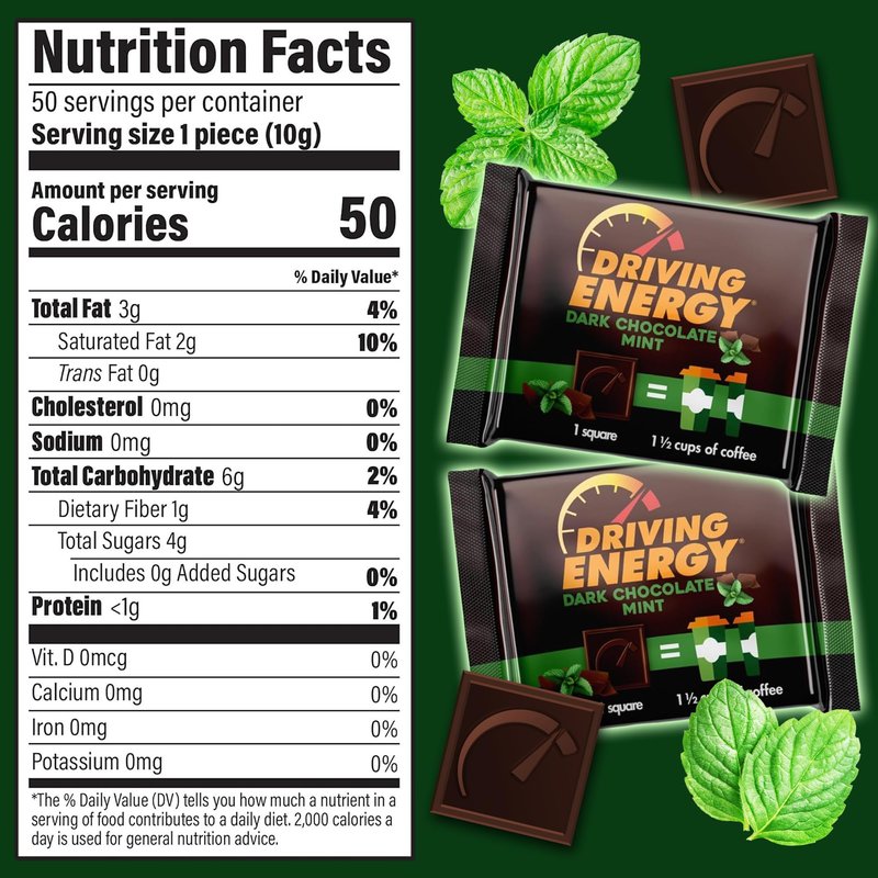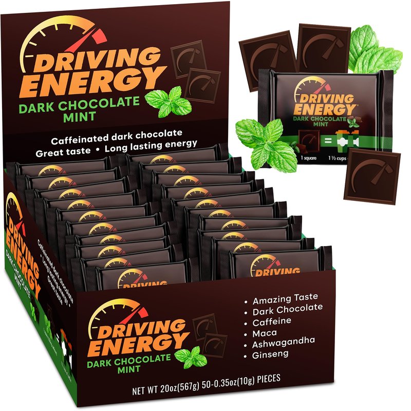 ZenEvo – Driving Energy Mint Dark Chocolate with Caffeine - Caffeinated Chocolate Energy Boost – Perfect for Helping Stay Awake While Working, Driving, Sports, and Work with No Crash – 50 Count