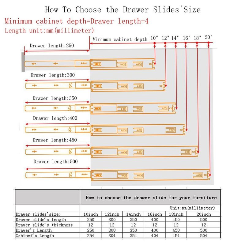 Features Solid steel bearing shaft, no noise during opening and closing. Slide material thicker, bearing 100 pounds, material plating products, will not rust. Internal rail separation is simple and easy to install. Use on bedroom furniture, sliding cabinet doors, office cabinets and bathroom cabinets. Size selection, slide length less than or equal to drawer depth minus 4 mm.