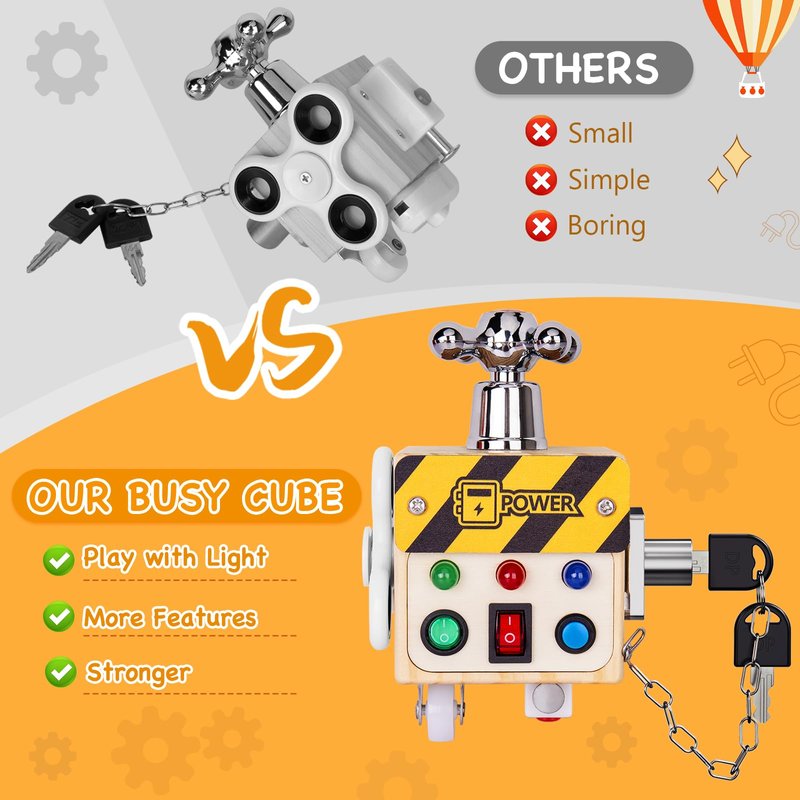 - 💡【Light Up Busy Cube】Our LED Busy Cube is the PERFECT CHOICE for you and your toddlers as it is made from natural wood, upgraded design with lights & buttons. This sensory toys is suitable for 1+ years kids and represents the perfect activity to play! Needs 2 AAA Batteries (Not Included)