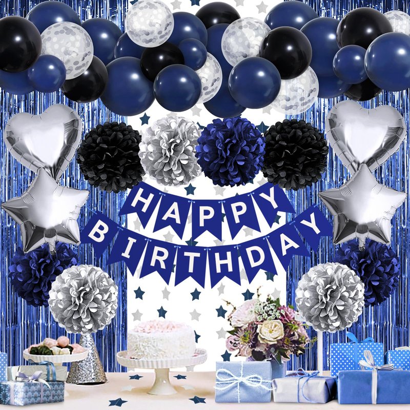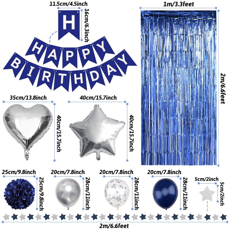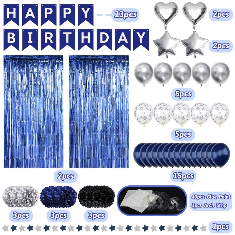 - What You Will Get: 1 x happy birthday banner, 3 x black paper pompom, 3 x silver paper pompom, 3 x navyblue paper pompom, 2 x star foil balloon, 2 x heart foil balloon, 2 x blue fringe curtain, 1 x paper garland, 15 x navyblue balloon, 5 x silver confetti balloon, 5 x silver balloon, 1 x balloon arch strip, 40 x glue point sticker.