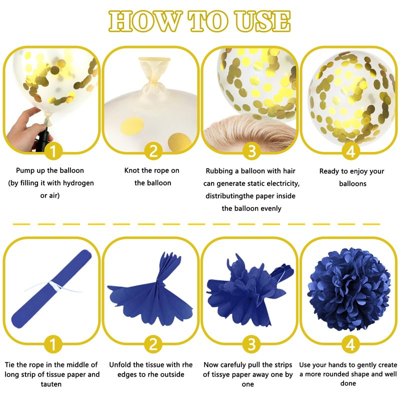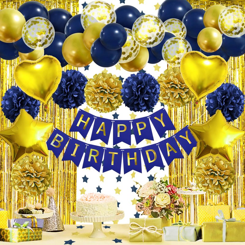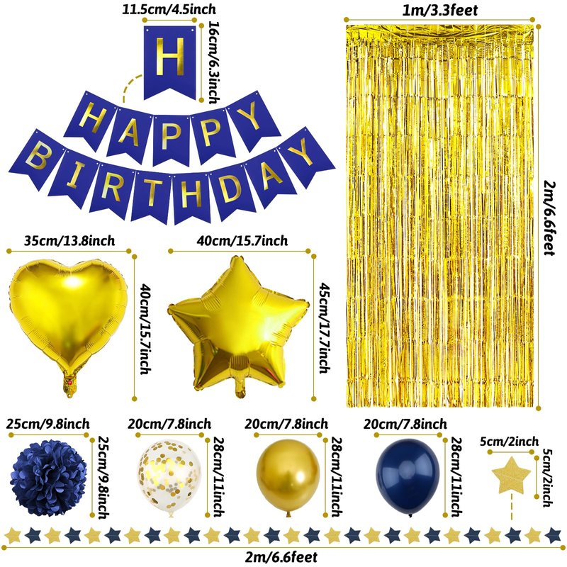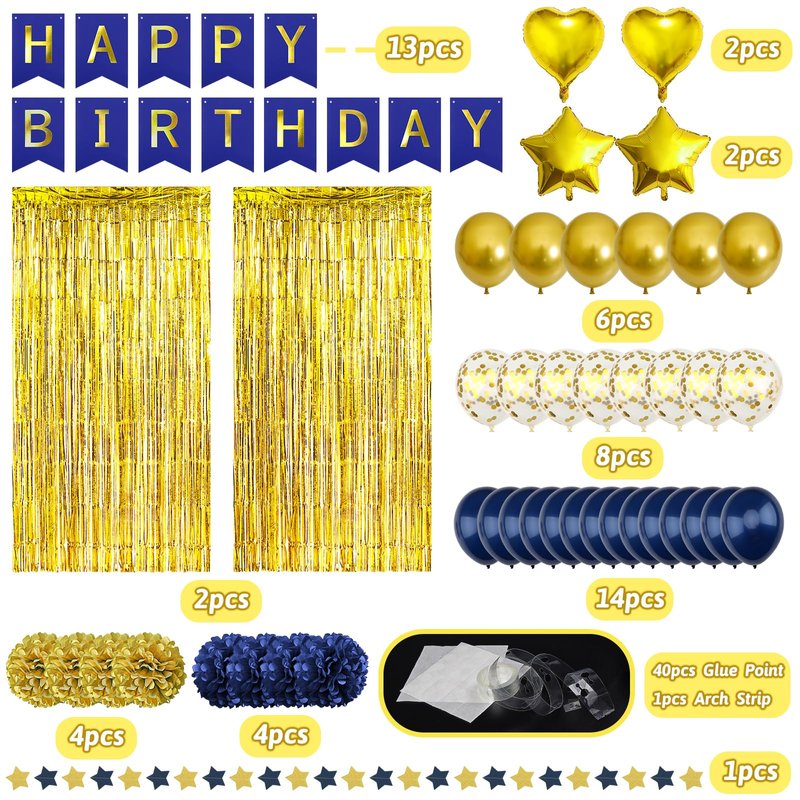- What You Will Get: 1 x happy birthday banner, 4 x navyblue paper pompom, 4 x gold paper pompom, 2 x star foil balloon, 2 x heart foil balloon, 2 x gold fringe curtain, 1 x paper garland, 14 x navyblue balloon, 8 x gold confetti balloon, 6 x gold balloon, 1 x balloon arch strip, 40 x glue point sticker.