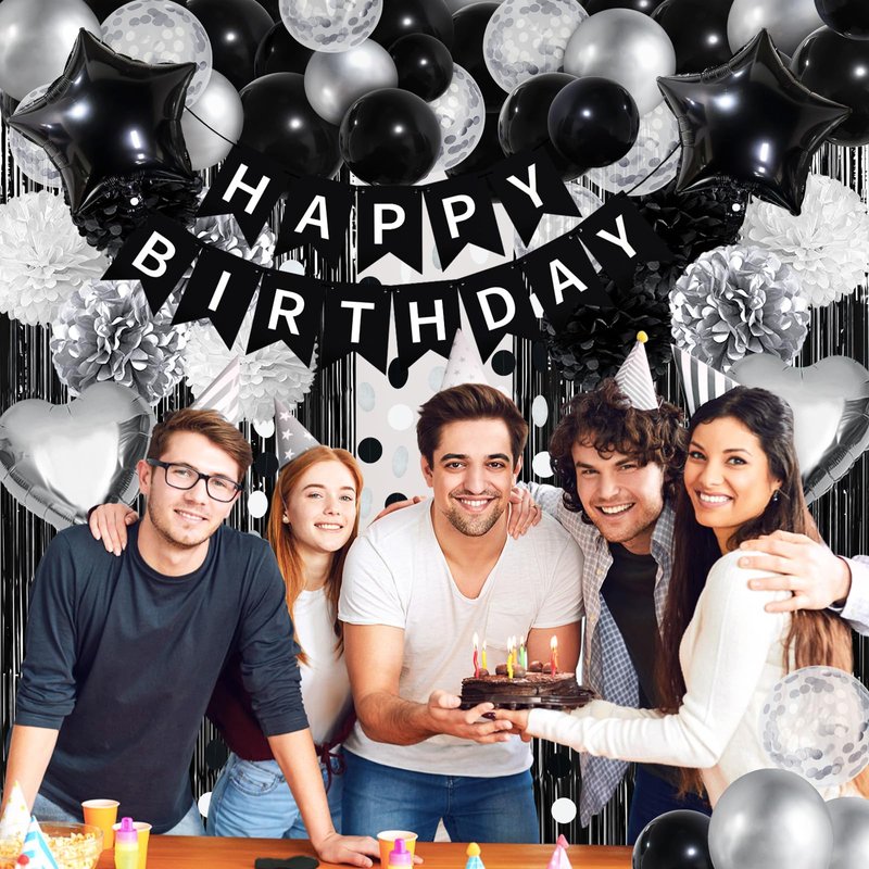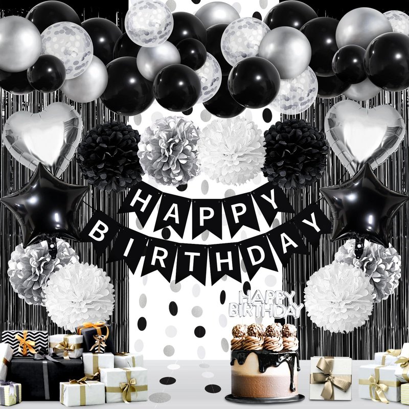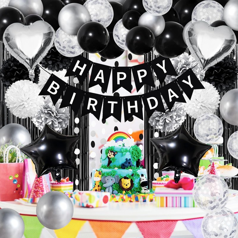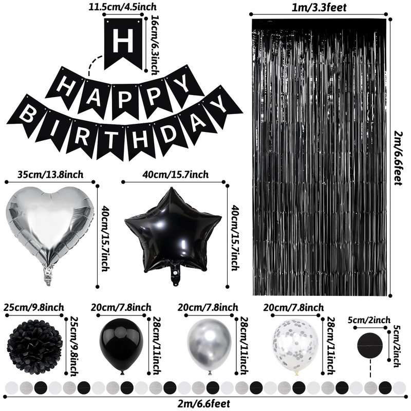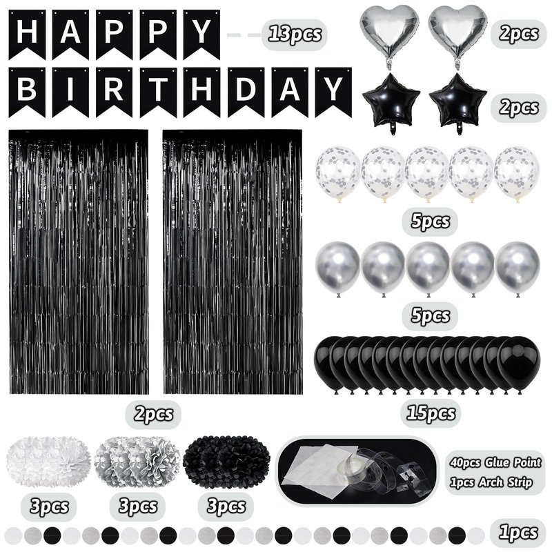 - What You Will Get: 1 x happy birthday banner, 3 x black paper pompom, 3 x silver paper pompom, 3 x white paper pompom, 2 x star foil balloon, 2 x heart foil balloon, 2 x black fringe curtain, 1 x paper garland, 15 x black balloon, 5 x silver confetti balloon, 5 x silver balloon, 1 x balloon arch strip, 40 x glue point sticker.