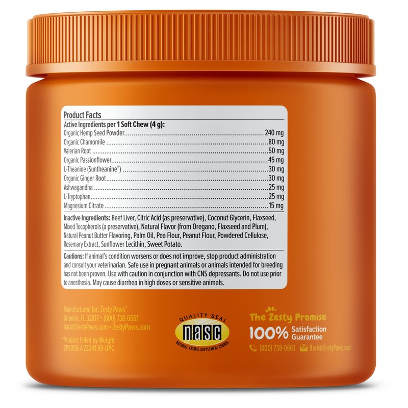 Zesty Paws Calming Bites are premium chewables that aid dogs with normal stress, nervousness, and hyperactivity to help them stay calm and at ease. This functional dog supplement features Suntheanine, an advanced form of LTheanine along with Ashwagandha. Together, these ingredients help support relaxation and calmness for your canine pet. Plus, these soft chews also include Chamomile, Valerian Root, and L-Tryptophan for additional support to keep your pup calm and relaxed Best of all, pets love the delicious taste (trust us, we have a hot spot where official four-legged testers tell us) that’ll give your canine companion an itch for more. Also, pet moms and dads can treat themselves to a sigh of relief knowing that their doggy will maintain composure to keep them feeling too cool for thunderstorms, separation, every day anxiety, fireworks, car rides and travel, and other moments of normal stress.