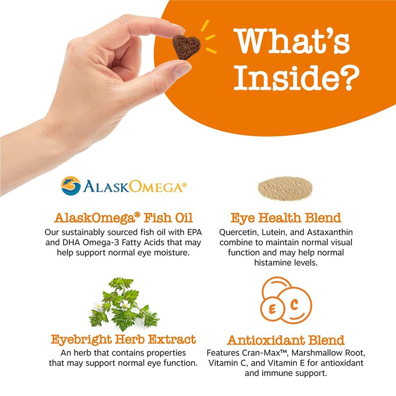 - Featuring AlaskOmega Fish Oil - At 100 mg per chew, this sustainably sourced fish oil provides EPA and DHA Omega 3 fatty acids that may help support normal eye moisture for those puppy dog eyes.