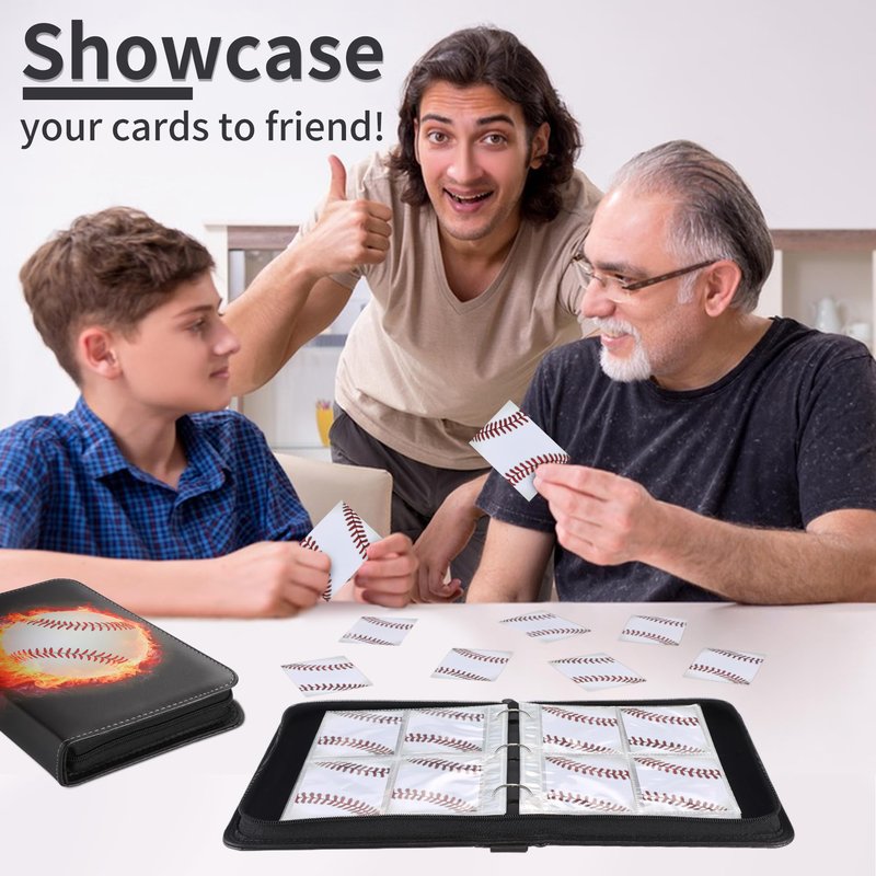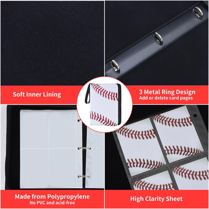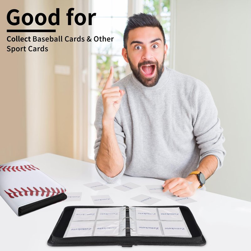 Zettokete 400 pockets trading card binder can meet your cards collection needs.It can help you storage and organize your cards and protect them.If you are a trading card or a sport card collector,you must have it!--Large Capacity--It can hold up to totally 400 cards. You can storage all your cards in this one binder.--Portable with Hand Strap--There is a hand strap on top of the card album.Just think about it,you open this binder and showcase all the cards you collect to your friends,you must be very proud.--Compatible with Standard Size Cards--Compatible with most trading cards and sports cards.Each pocket is 68MM/2.67"(W), 92MM/3.62"(L).--3 Ring Design--The 3 ring design may let you add or delete card sleeves as your collection need.--Zipper Design--This card book has a zipper to prevent the card and inner pages from falling off.Smooth zipper for easy opening and closing.--Waterproof--The card holder is made of PU leather.Waterproof and scratch resistant.--50 Removable Card Sheets--The card sheets for 3 ring binder is made from polypropylene.No PVC and acid-free.Cards will not stick to it.High clarity sleeves let you display and see all the details of the cards.--A Good Gift--A good gift for your kids to collect cards.Specification:--Material:PU leather--Item Size:9.45N×7 IN×1.9 IN--Item Weight:1.16 LB--Pocket Style:4 pocket--Each Pocket Size:3.62 IN×2.67 IN--Binder Card Sleeves:50 pages(removable)--Capacity:Totally 400 cards--Product Color:Baseball