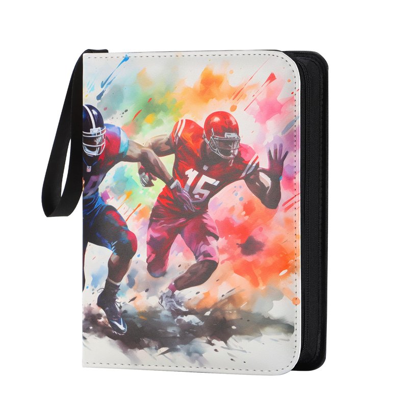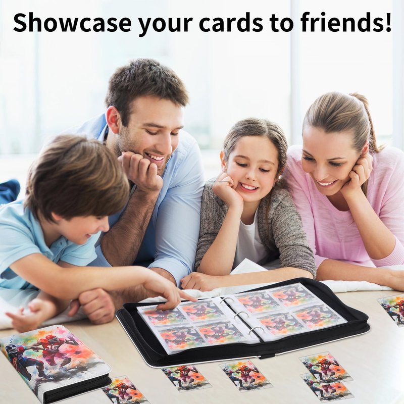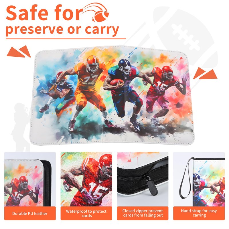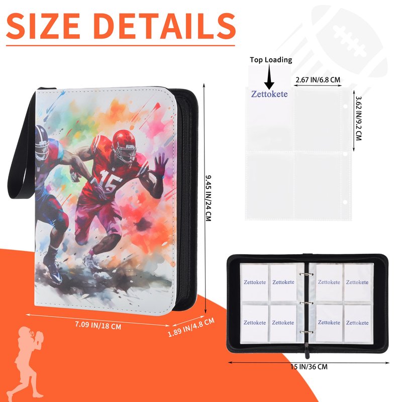 Zettokete 400 pockets trading card binder can meet your cards collection needs.It can help you storage and organize your cards and protect them.If you are a trading card or a sport card collector,you must have it!--Large Capacity--It can hold up to totally 400 cards. You can storage all your cards in this one binder.--Portable with Hand Strap--There is a hand strap on top of the card album.Just think about it,you open this binder and showcase all the cards you collect to your friends,you must be very proud.--Compatible with Standard Size Cards--Compatible with most trading cards and sports cards.Each pocket is 68MM/2.67"(W), 92MM/3.62"(L).--3 Ring Design--The 3 ring design may let you add or delete card sleeves as your collection need.--Zipper Design--This card book has a zipper to prevent the card and inner pages from falling off.Smooth zipper for easy opening and closing.--Waterproof--The card holder is made of PU leather.Waterproof and scratch resistant.--50 Removable Card Sheets--The card sheets for 3 ring binder is made from polypropylene.No PVC and acid-free.Cards will not stick to it.High clarity sleeves let you display and see all the details of the cards.--A Good Gift--A good gift for your kids to collect cards.Specification:--Material:PU leather--Item Size:9.45N×7 IN×1.9 IN--Item Weight:1.16 LB--Pocket Style:4 pocket--Each Pocket Size:3.62 IN×2.67 IN--Binder Card Sleeves:50 pages(removable)--Capacity:Totally 400 cards--Product Color:Football