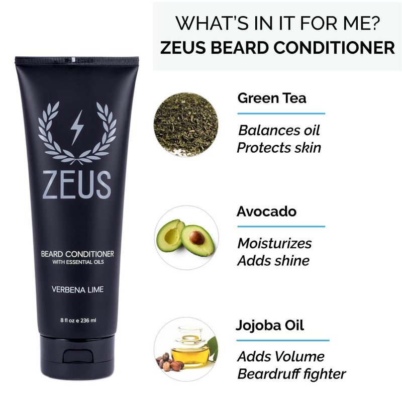 - CONDITIONER: The next step after our beard shampoo is our ZEUS Beard Conditioner, created to aide with dry and itchy skin beneath the beard and that awkward stage of beard growth. Infused with natural ingredients to tame even the bristliest of beards and mustaches.