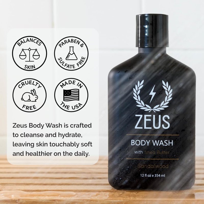 - SANDALWOOD: Embrace the invigorating essence of our signature spicy wood sandalwood scent with Zeus Body Wash. Perfect for your daily shower routine, it promises to energize, refresh, and boost your confidence, whether it's day or night.