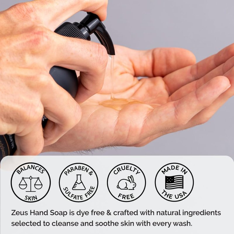 - KEY INGREDIENTS: ZEUS Liquid Hand Soap is designed to effectively cleanse all types of hands. It is crafted with vegan-friendly ingredients and is free from artificial colors or dyes. Essential oils such as lavender, tea tree, and lemon are utilized for their ability to assist in eliminating dirt and grime.