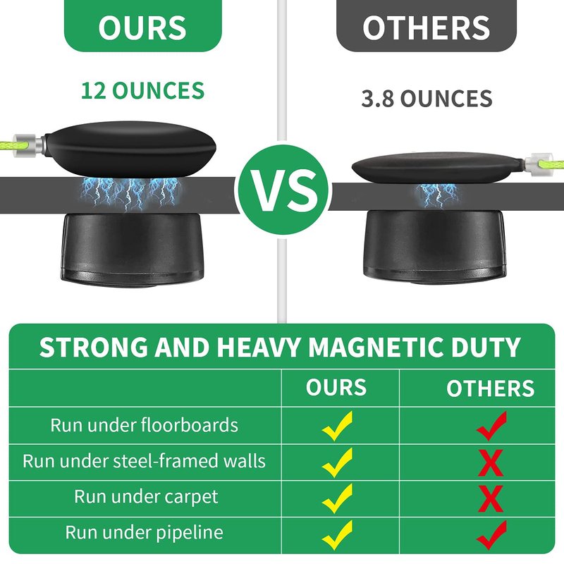 - 【LARGE MAGNETS JUMP OVER OBSTACLES】You’re making sure the cables have a clear path to run through while unknowing exactly where it is.The strength of the magnet is what makes this tool what it is, Large magnets can quickly jump over water pipe obstacles. You can quite easily run it underneath floorboards with accuracy.