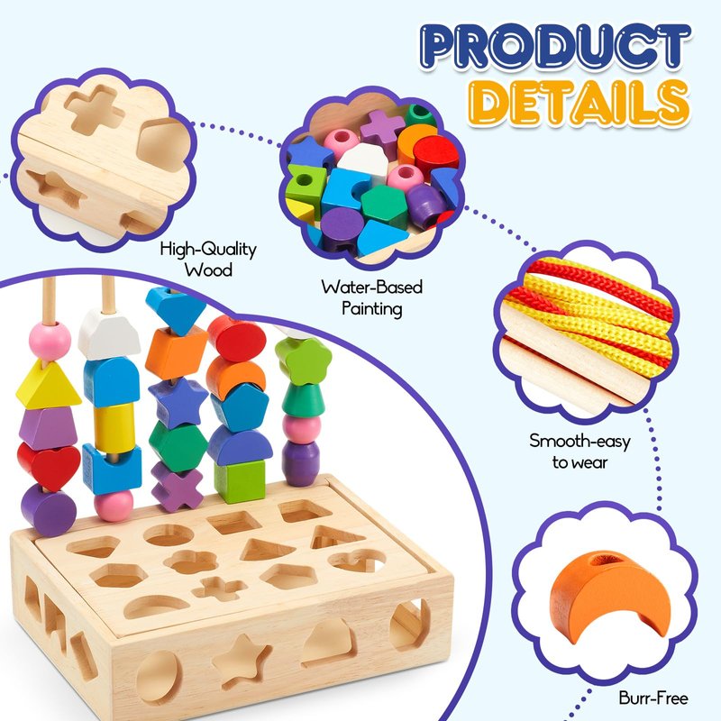 - Toddler Wooden Toys:Our wooden toys come with 25 colorful wooden beads in various shapes, 1 wooden stand, 2 laces with wooden sticks, a shape storage box and 16 double-sided cards, The sensory toys are crafted from high-quality solid wood with smooth edges, ensuring durability and safety during play. The beads are coated with water-based paint, providing a safe play experience for children. Designed with a suitable size for easy handling, these toys are perfect for toddlers aged 3 and 4.all designed for children aged 3 and up to enjoy!