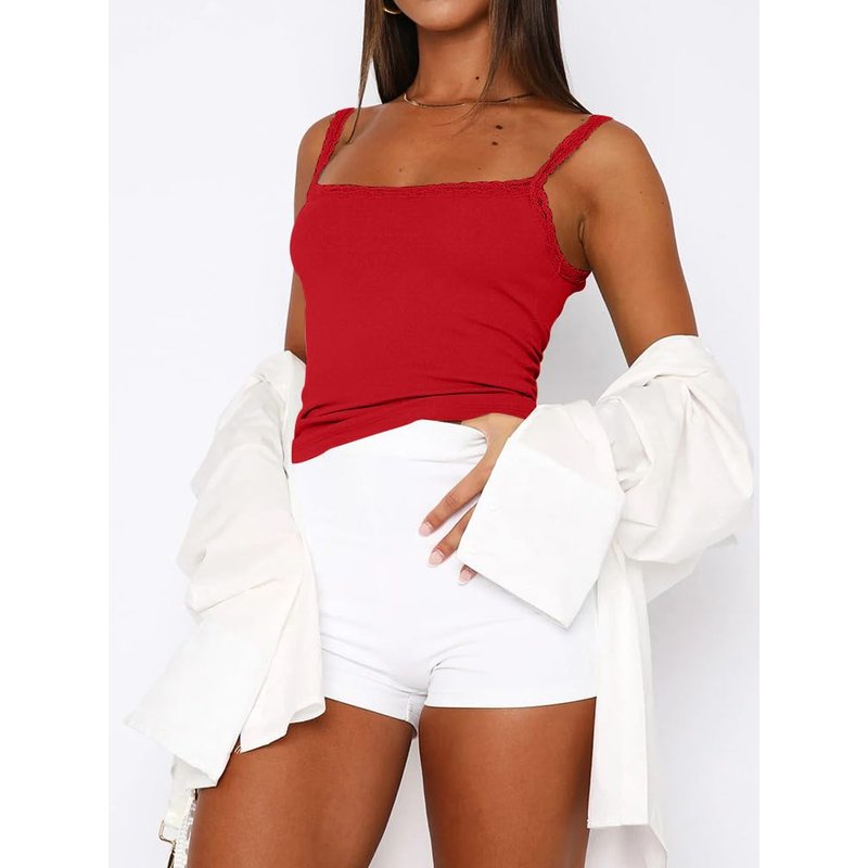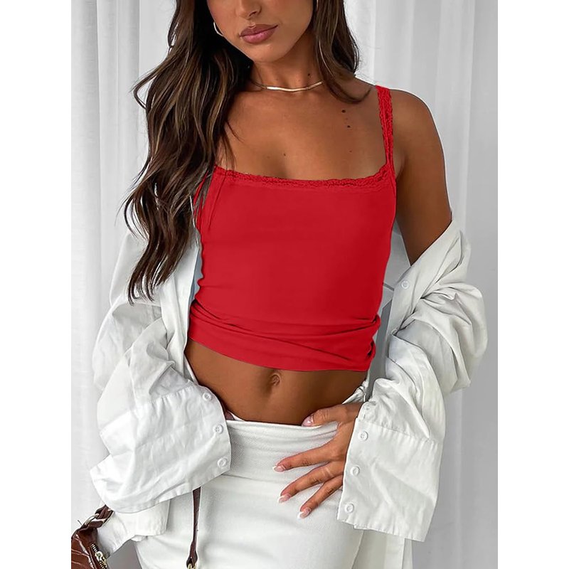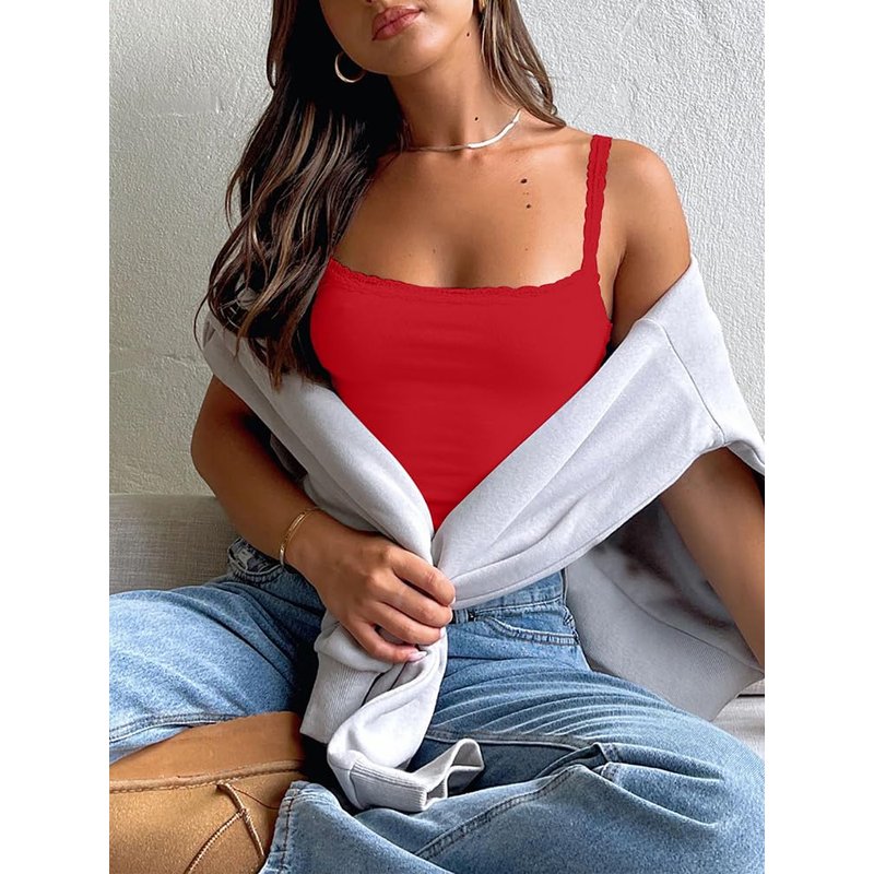 zhaistar Sleeveless Camisole Tank Tops for Women Y2K Spaghetti Strap Lace Trim Slim Fit Basic Cami Shirts Red L