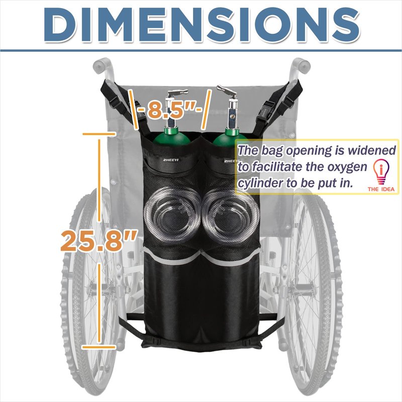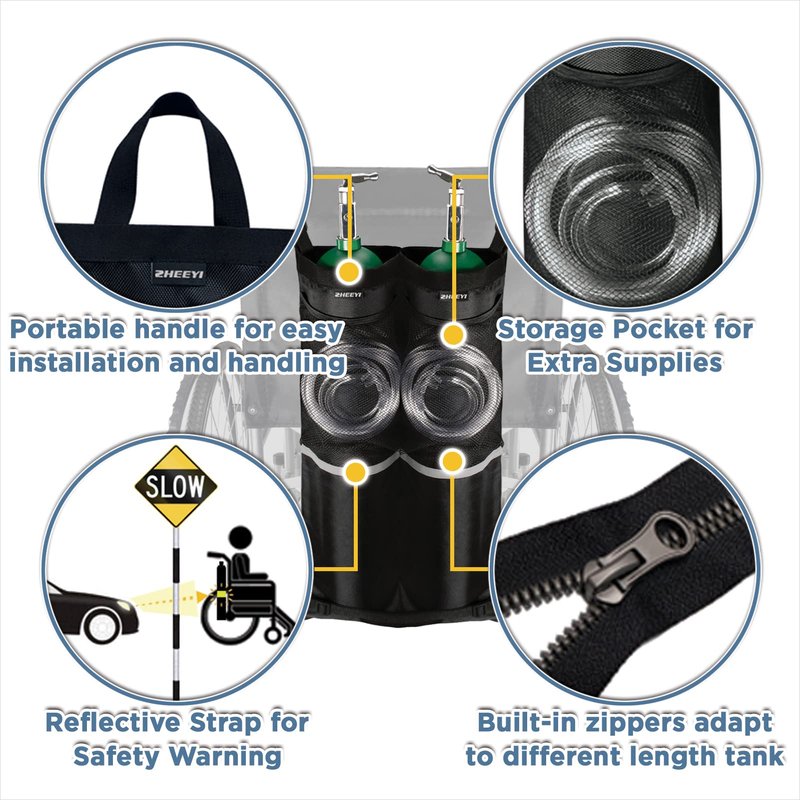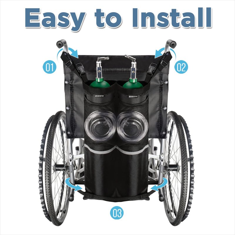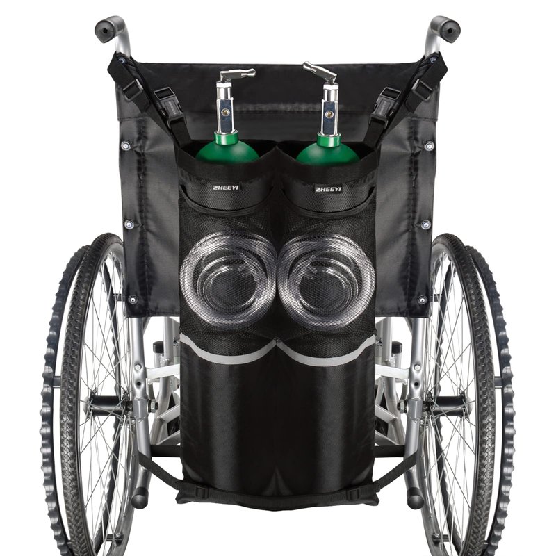 - Features: ZHEEYI Oxygen Cylinder Bags for Wheelchairs, it applies to almost all wheelchairs. The product is made of specially thickened, tear resistant, wear-resistant, easy-to-clean nylon fabric. The bag is equipped with a handle for easy installation and handling by caregivers. This wheelchair oxygen cylinder bag is a great tool for those who need to carry an oxygen cylinder outside. Wheelchair users can easily carry oxygen cylinders.