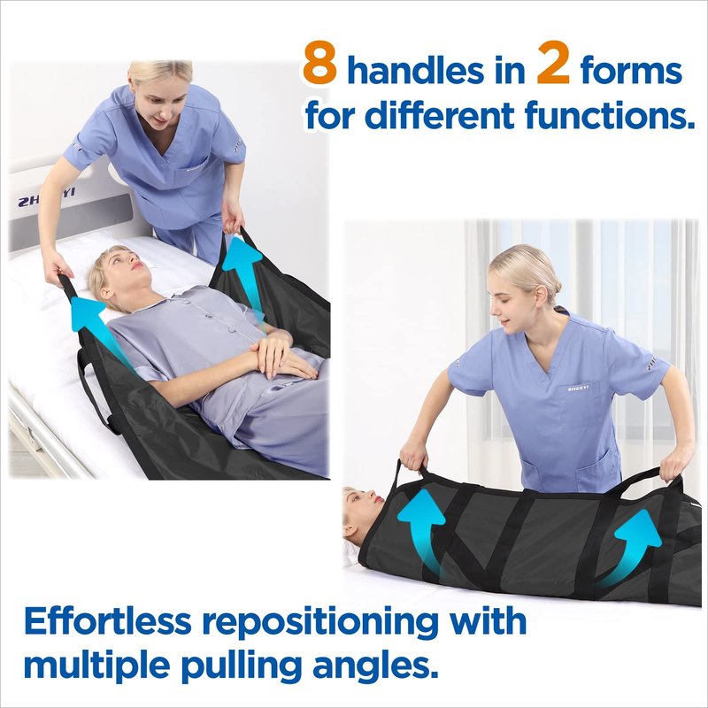 - TURNING, REPOSITIONING & LIFTING MADE EASY! Our double-sided nylon fabric patient sheet is equipped with 8 heavy-duty, reinforced handles that will help you transfer, reposition, turn or lift any patient with relative ease.