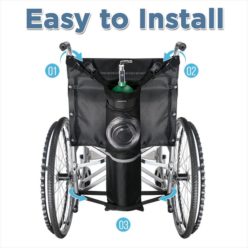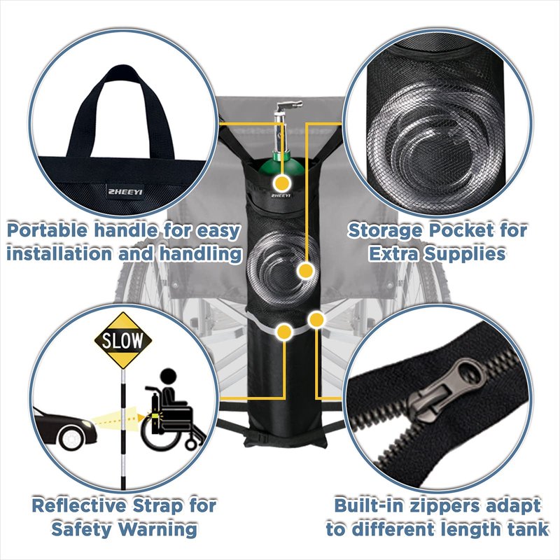 - Features: ZHEEYI Oxygen Cylinder Bags for Wheelchairs, it applies to almost all wheelchairs. The product is made of specially thickened, tear resistant, wear-resistant, easy-to-clean nylon fabric. The bag is equipped with a handle for easy installation and handling by caregivers. This wheelchair oxygen cylinder bag is a great tool for those who need to carry an oxygen cylinder outside. Wheelchair users can easily carry oxygen cylinders.