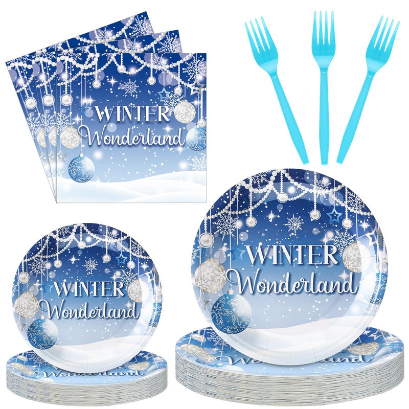 - More Time to Happy: spend more time enjoying your party with our winter wonderland tableware; Designed with convenience in mind, this disposable set of cutlery and dishes makes cleaning up easy; After all the fun, gather set and toss them in the trash