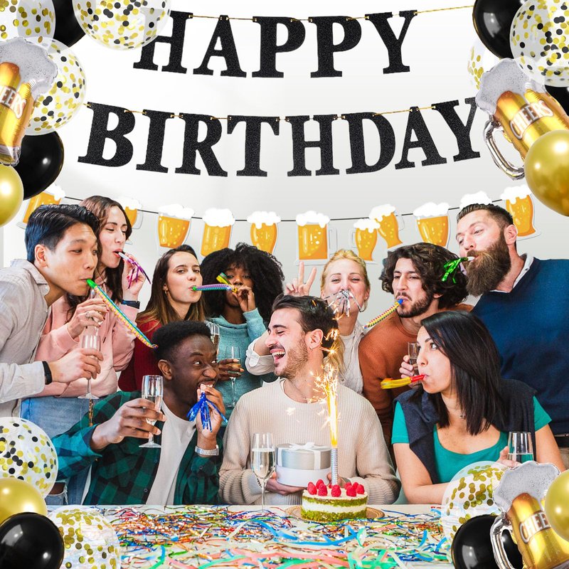 - Birthday Party Decorations Set Include:1x happy birthday banner,1x beer banner,30x latex balloons(10 black, 10 gold, 10 confetti balloons),6x beer balloon,these balloon perfect for decorate birthday party.