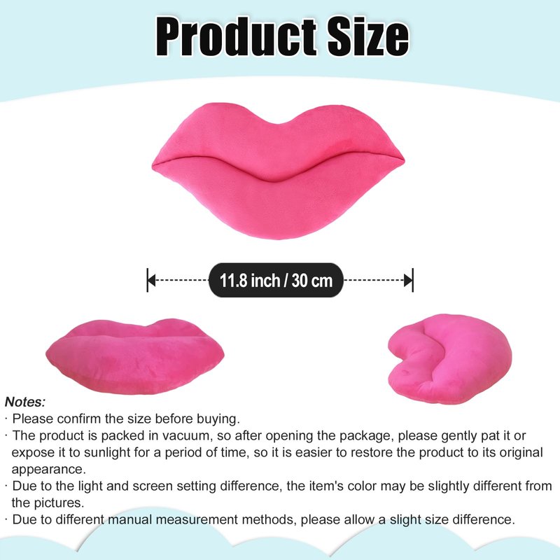 - PRODUCT PACKAGING – This product includes a total of 2 pink lip shaped pillows, each with a total length of 11.8 inches (30 cm). Due to vacuum packaging, after opening the packaging, it can be gently tapped and left for a period of time, or exposed to sunlight for a period of time, which is more likely to restore the original appearance and size of the product.