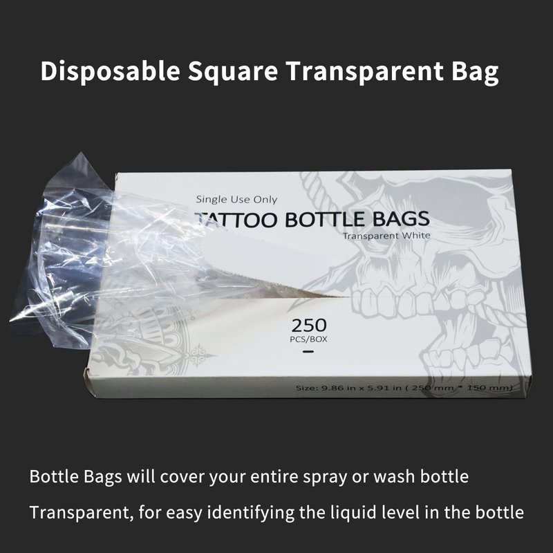 - 250Pcs Tattoo Wash Bottle Bags : 9.8 in * 5.9 in (25cm*15cm) , Disposable Square Transparent Bag.【Not include bottles】