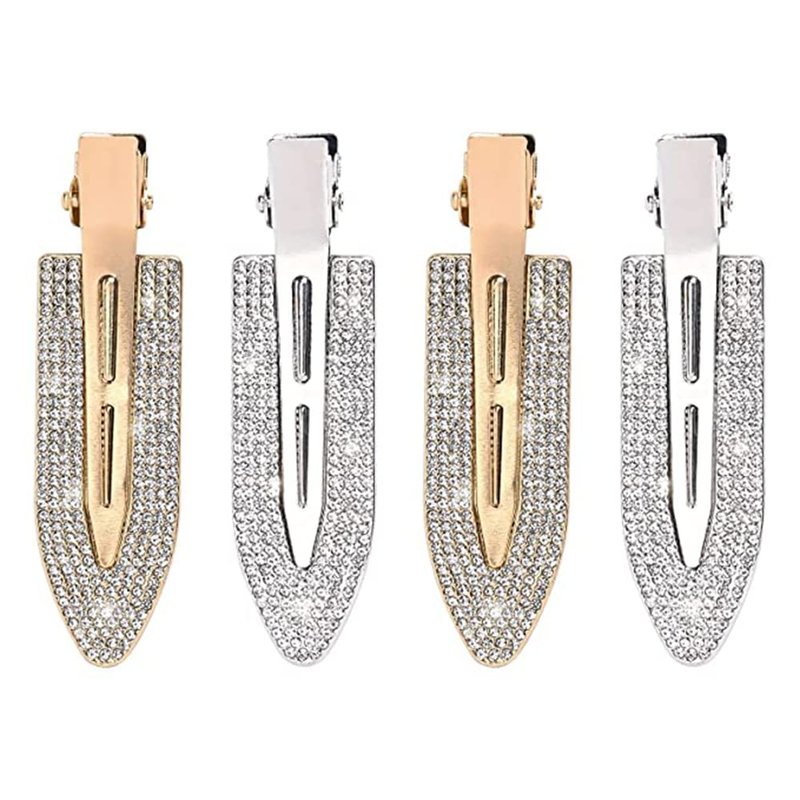 - Package includes: no bend hair clips packed 4 pieces, (2pcs gold and 2pcs silver) , size: 2.63x0.7 inches, which is of personalized shiny rhinestone diamonds design. Our rhinestone hairpins will not cause wrinkles to your hair and matching for a fashionable look