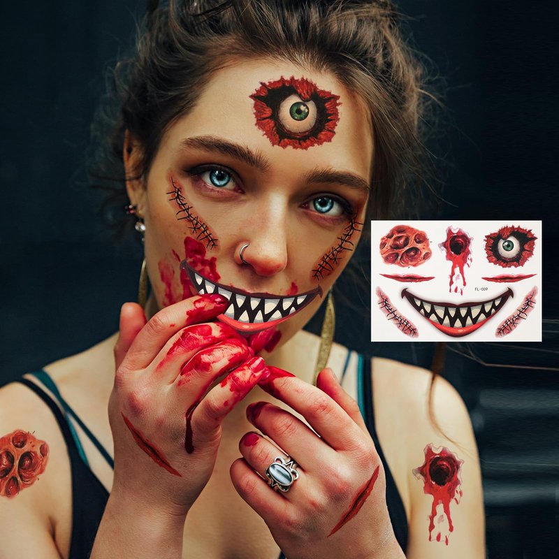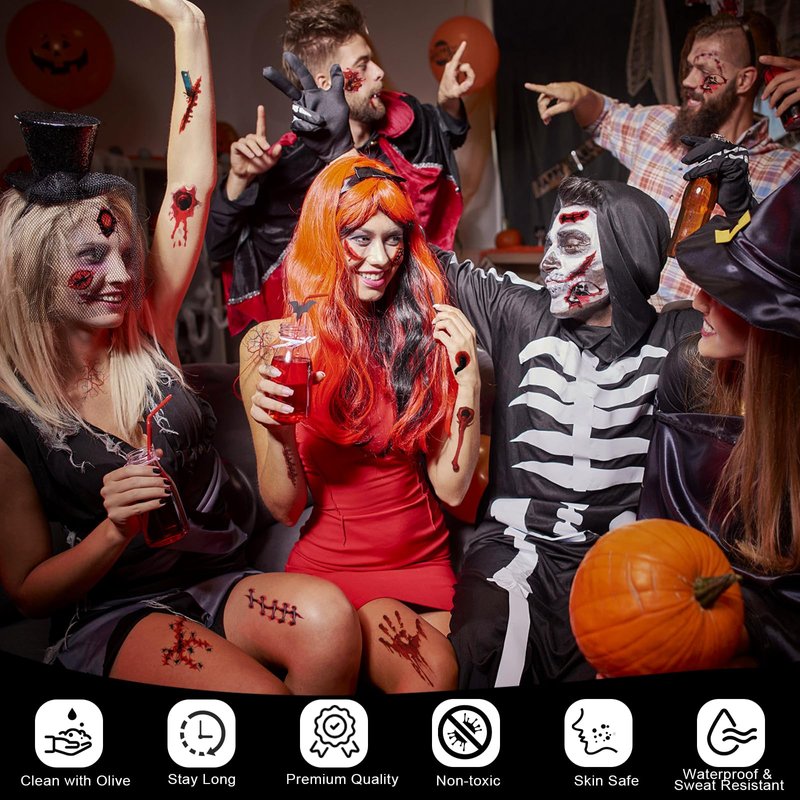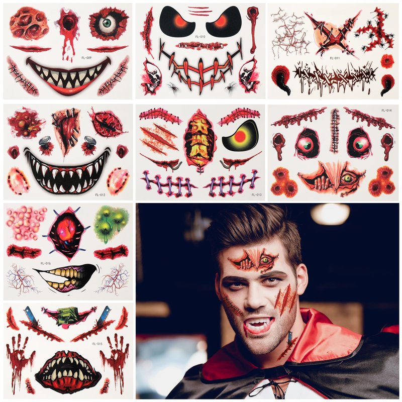 - The Halloween Spooky Kit Revelation -- This tattoo kit contains 8 sheets of Zienlay Halloween scar tattoos. With its 3D design and clear ink, the scar wounds look more realistic and natural. Patterns like large bloody wounds that exude a terrifying and horror-filled aura, bite marks that could be from menacing vampires, cuts, scars, stitches, and scratches create an atmosphere of spookiness. An unforgettable Halloween experience starts with it.