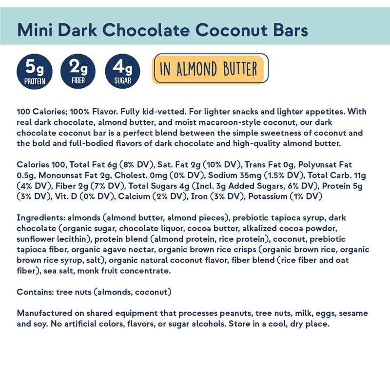 - HIGH PROTEIN BAR: A blend of coconut sweetness, the flavor of dark chocolate and almond butter. Gluten-free, GMO-free, snack bar with 10 grams of plant-based protein, and optimum ingredients giving you energy and nutrition on each bite. Only 100 calories!