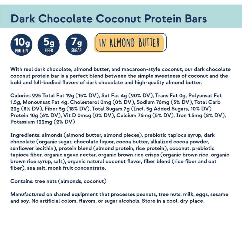 - A Nutritive Snack Bar that Packs a Flavorful Punch: With real dark chocolate, almond butter, and macaroon-style coconut, our Dark Chocolate Coconut protein bar is a perfect blend between the simple sweetness of coconut and the bold and full-bodied flavors of dark chocolate and high-quality almond butter.