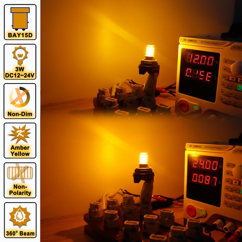 - Specifications: 12 Volt Brake Lights 1157 2057 2357 7528 BAY15D Amber LED Bulbs Replacement for RV Car Camper Trailer Tail Brake Stop Lights, Amber Yellow,DC12-24V,4Pack,Size:0.66*1.53inch,3W,330lm.