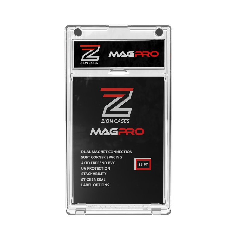 We have redefined the Magnetic Card Holder! Introducing the Magpro by Zion Cases. This version of the trading card holder has new features and upgraded options that will give the collector more protection and appeal in the trading card hobby or at trade night events. Zion Cades is continuously developing new products that provide each card collector with precisely what they need to protect their trading cards. MagPro has quickly become the go-to choice for collectors looking to protect their valuable cards and have that graded card look simultaneously. Whether someone is a seasoned collector or just starting, MagPro is the perfect solution for anyone looking to protect their collection. Magnetic card holders for trading cards on the market today have a single magnet closure that we felt was not sufficient to prevent unintended or accidental openings. That's why we created MagPro with 2 powerful magnets for optimal security of your valuables and a lot more. The MagPro magnetic card case is compatible with all Zion Slab Cases, and the clear plastic offers secure protection of your valuable trading cards without losing that crisp graded card look. MagPro was designed similar in size to the standard PSA graded card slabs to ensure uniformity across your collection. MagPro features a double-hinged bottom for easy card placement and removal, soft spacing on all four corners, Acid and PVC-free plastic that ensures UV protection, and embossed edges so you can easily stack. We also offer six card holder sizes to choose from and the ability to customize your MagPro labels to make your collection unique.