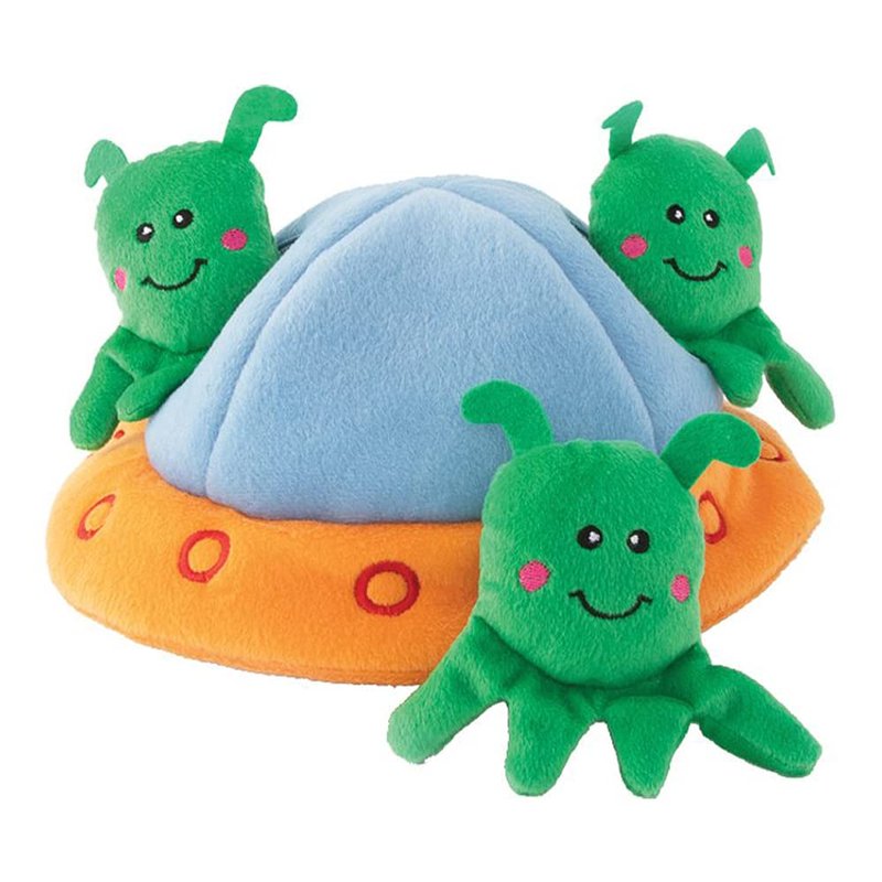 - Interactive Hide-and-Seek Fun: Includes a UFO-shaped plush burrow and three squeaky alien toys, perfect for engaging your dog in mentally stimulating play.