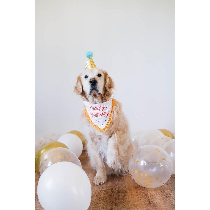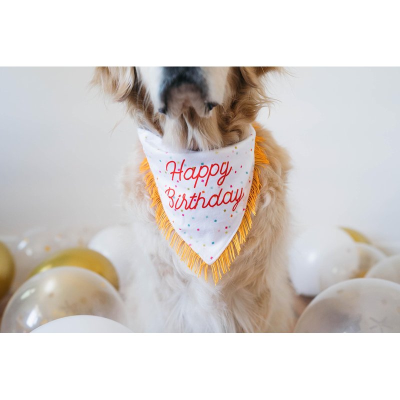 Celebrate your doggo’s special day with this extra special Birthday Bandana and Bone 2-pack set. The adorable bandana features a festive “Happy Birthday” and polka dot print, frilly trim, and red ties. The matching squeaky bone toy features an allover polka dot pattern and red ribbon bow that make it the perfect gift for the occasion! - One size fits most (fits dog necks under 20 inches) - Material: 100% polyester - Machine wash (delicate cycle) Size: 27 inch long