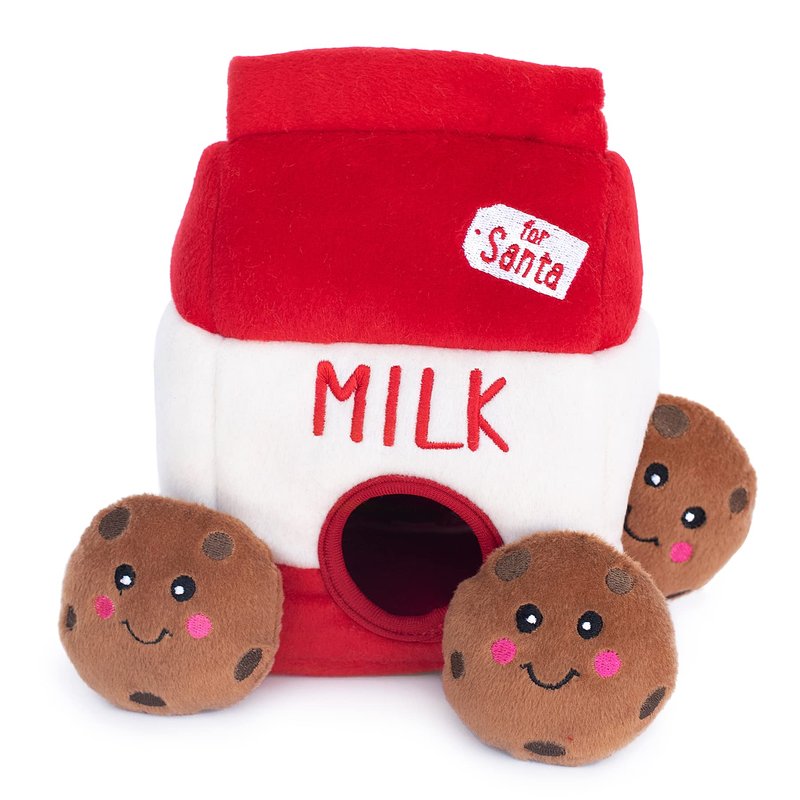 Perfect for the holiday season, your dog will love burying their nose in the milk carton to dig out the cookies!Once your playful pup has them all out, they ll be begging you to put them back in again and again for hours of fun!It s the perfect interactive toy for keeping your dog busy and engaged through hide-and-seek play, prevents boredom and promotes mental stimulation.Squeaker: 1 round squeaker in each cookieBurrow size: 8.5 x 6.5 x 6.5 in073186Zippy Burrow toys are the perfect interactive toy for keeping your dog busy and engaged. Through hide-and-seek play, Zippy Burrow toys help prevent boredom and promote mental stimulation! This interactive hide-and-seek toy comes with 1 Milk Carton and 3 small squeaky Cookie Miniz.