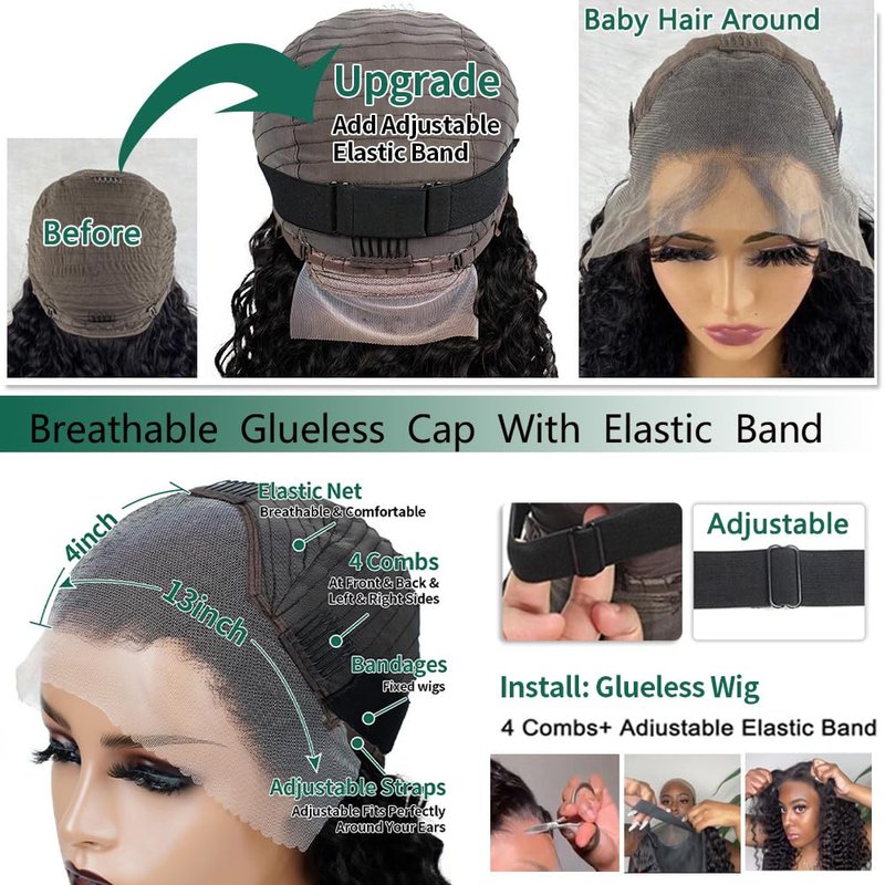 • 【💖Glueless Human Hair Wigs with Baby Hair】Deep wave glueless wigs human hair pre plucked, medium cap size(22 inch - 22.5 inch), breathable & durable lace material make it more comfortable, with 3 combs and two adjustable straps. Also, there is an adjustable band to help you wear the wig easily and quickly, which is so friendly to beginners.You can feel free to take it away without affecting the normal using of this no glue wigs.