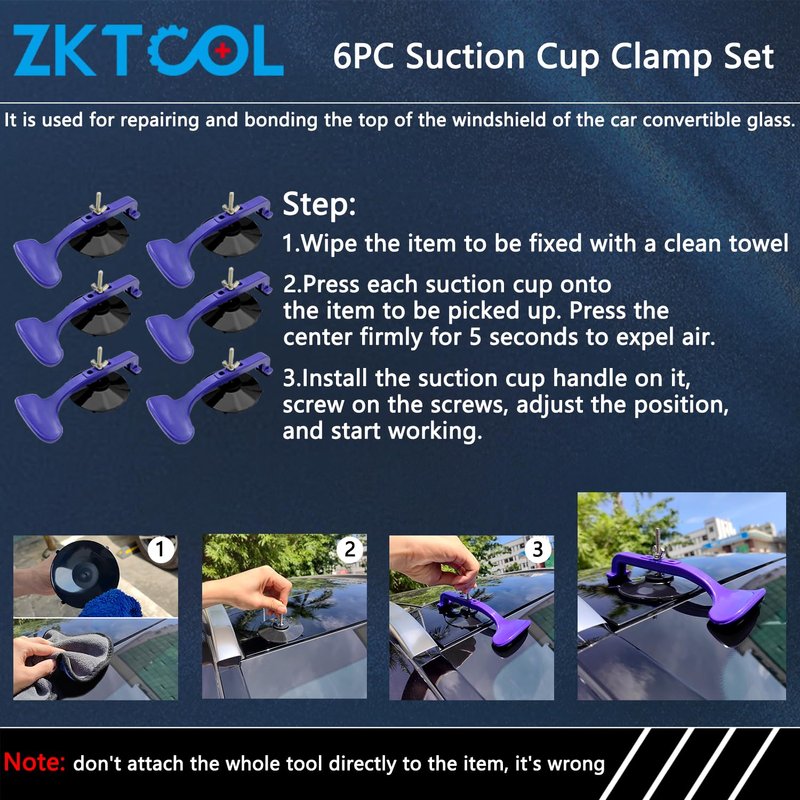 Upgraded Design: Includes large suction cups with superior adhesive power and gripping force, ensuring a secure and reliable hold. Product Description: The ZKTOOL 6PC Suction Cup Clamp Set is a versatile solution for fixing leaks and sealing rear windows in convertibles. It is specifically designed for convertible top and windshield repair, offering a reliable and convenient toolset. The suction cup clamps provide hands-free gripping, allowing for secure bonding and sealing of convertible windshields. The included sponge pads protect the car body from scratches during the repair process. These clamps offer strong adhesion to non-porous surfaces such as glass and metal, making them suitable for use in all types of vehicles. They provide a secure hold, ensuring that the repair or sealing job is performed effectively. In addition to their primary function, these clamps have a wide range of applications. They can be used to safely secure panel trims, decals, badges, window trims, and sensors during preparation or adhesive setting processes, providing added convenience and versatility. The set includes two clamps with upgraded large suction cups, ensuring superior adhesive power and gripping force. This guarantees a secure and reliable hold, giving you peace of mind during your repair or sealing tasks. Choose the ZKTOOL 6PC Suction Cup Clamp Set for dependable and versatile performance when working on convertible tops and windshields. It is a must-have tool for any automotive repair enthusiast or professional.