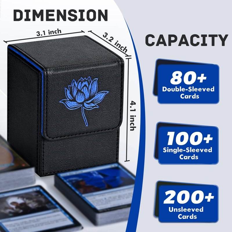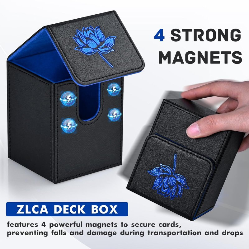 ZLCA Card Deck Box for MTG Cards with 2 Dividers, Card Storage Box Fits 100+ Single Sleeved Cards, PU Leather TCG Card Deck Case Holder for Magic Commander Yugioh (Black&Blue,Lotus)