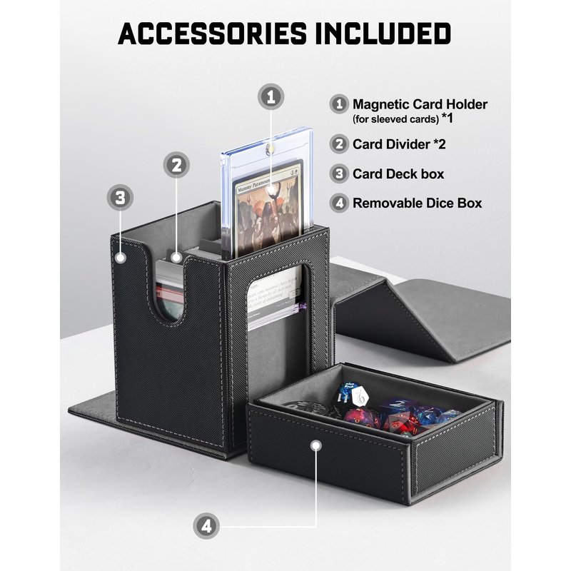 - Ample Capacity: This ZLCA mtg deck box commander provides storage for up to 100 double-sleeved cards or 140 single-sleeved or 240 unsleeved cards, A dice tray is also included that ensures all your gaming essentials are neatly organized and within easy reach