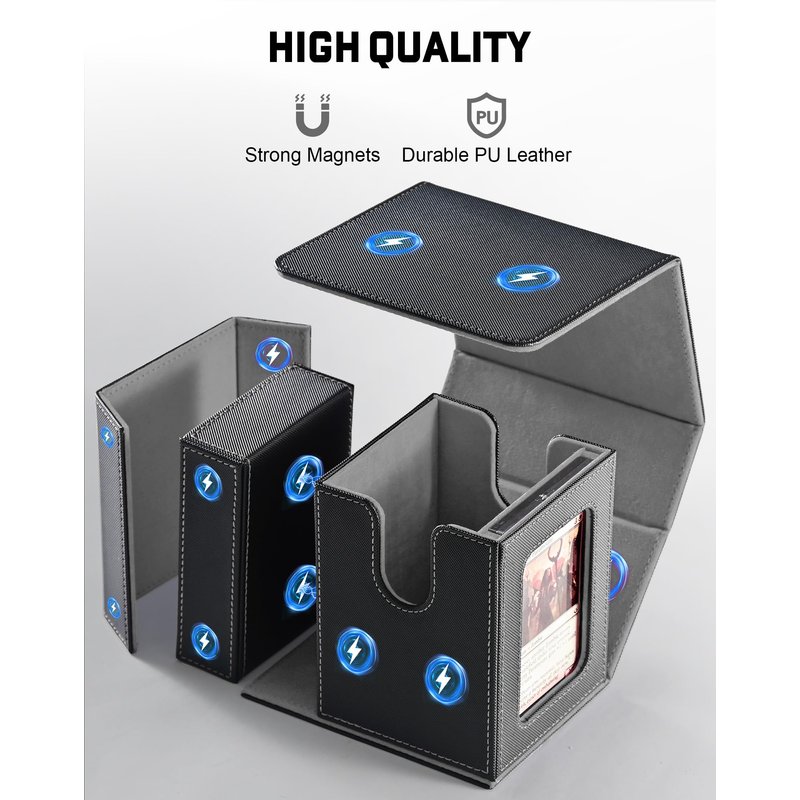 - Innovative Design: Our commander deck box features a convenient U-shaped opening, allowing you to flip the lid and easily view your cards. It can stand upright with the lid flipped open, providing quick access to your cards during gameplay. This box not only enhances your gaming experience but also adds a stylish touch to your tabletop setup